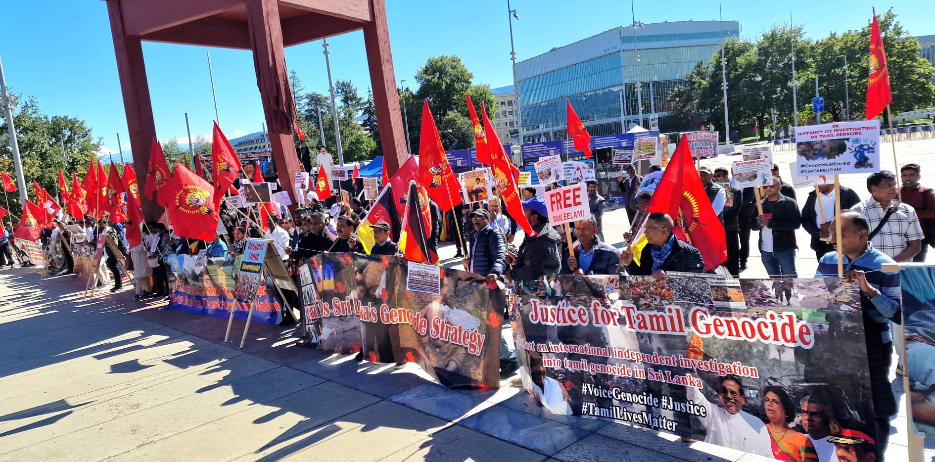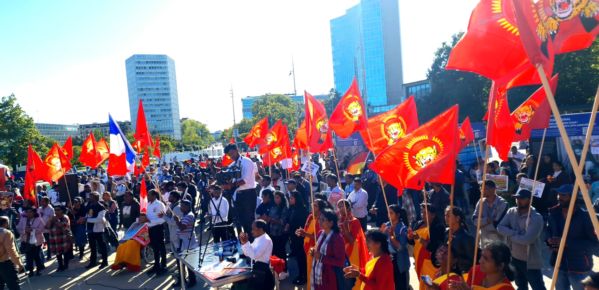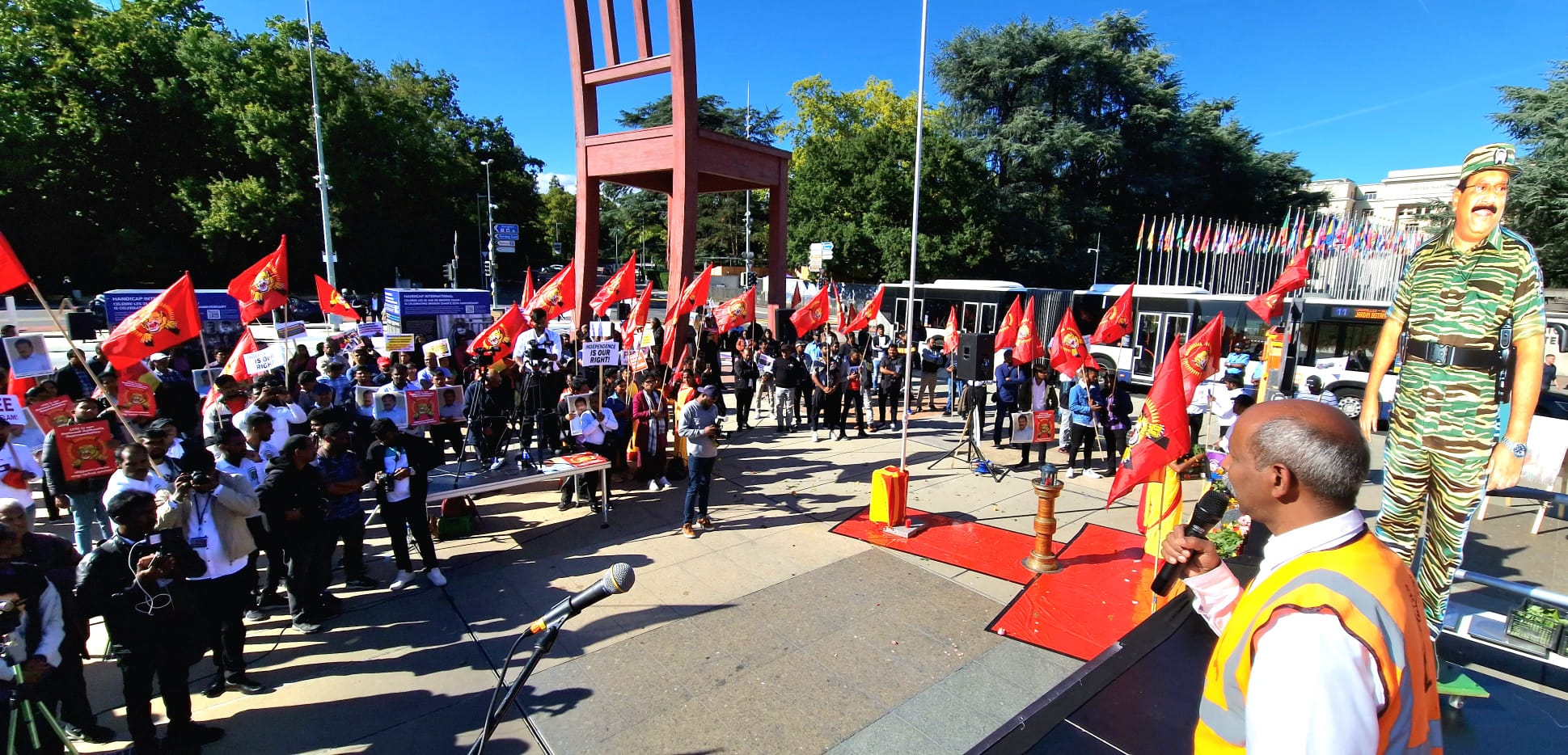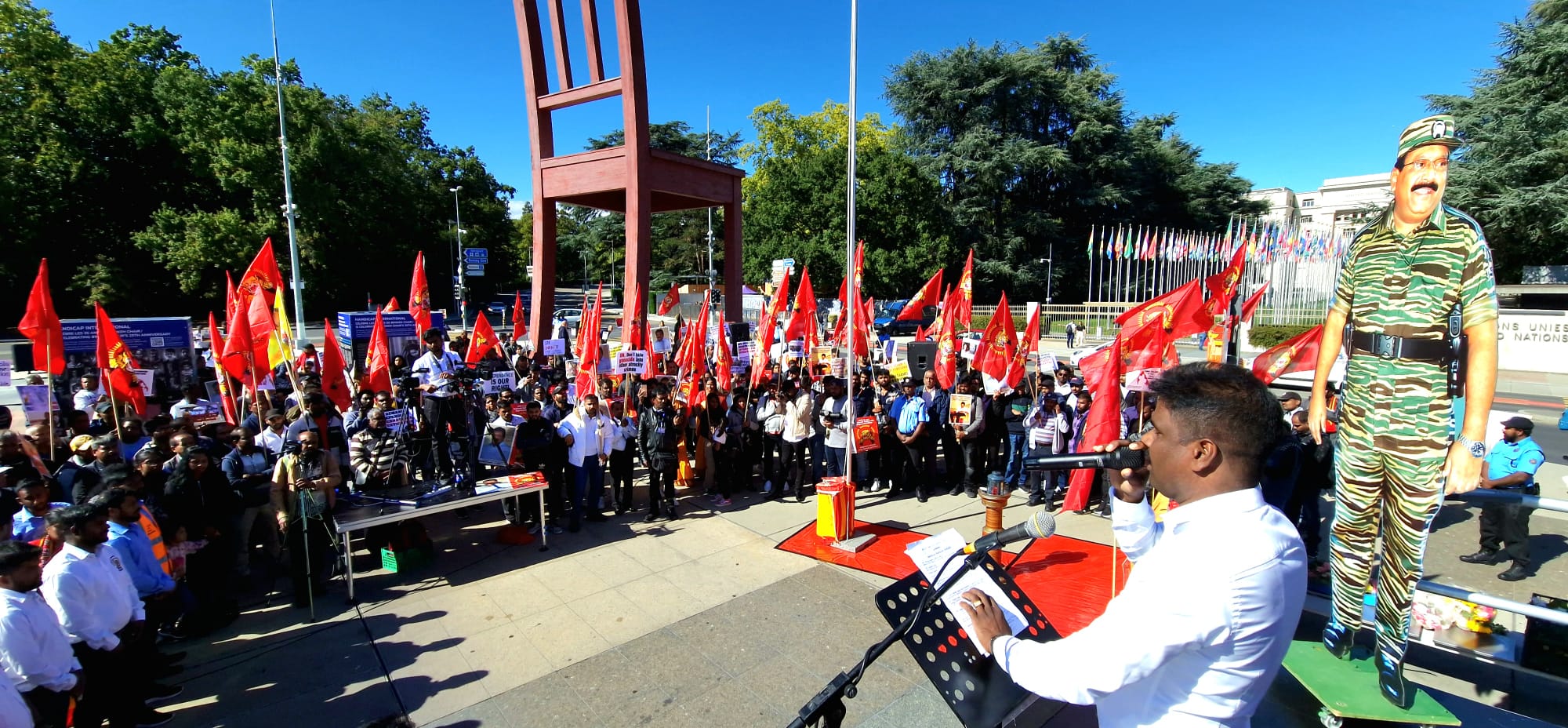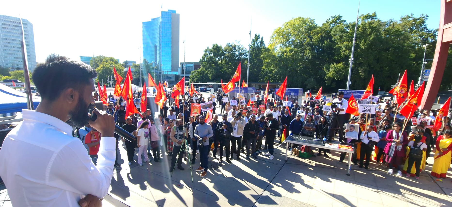 எங்களுக்கான நீதியை எங்களுக்குத் தாருங்கள் என்ற உரிமை முழக்கத்தோடு, சிறிலங்காப் பேரினவாத அரசினால் தொடர்ச்சியாக தமிழ்மக்கள் மீது மேற்கொள்ளப்பட்டுவரும் இன அழிப்பிற்கு நீதிகேட்டு ஐ.நா முன்றல் ஈகைப்பேரொளி முருகதாசன் திடலில் முன்னெடுக்கப்பட்ட கவனயீர்ப்புப் போராட்டத்தில் நூற்றுக்கணக்கான தமிழ்மக்கள்; கலந்துகொண்டிருந்தனர்.