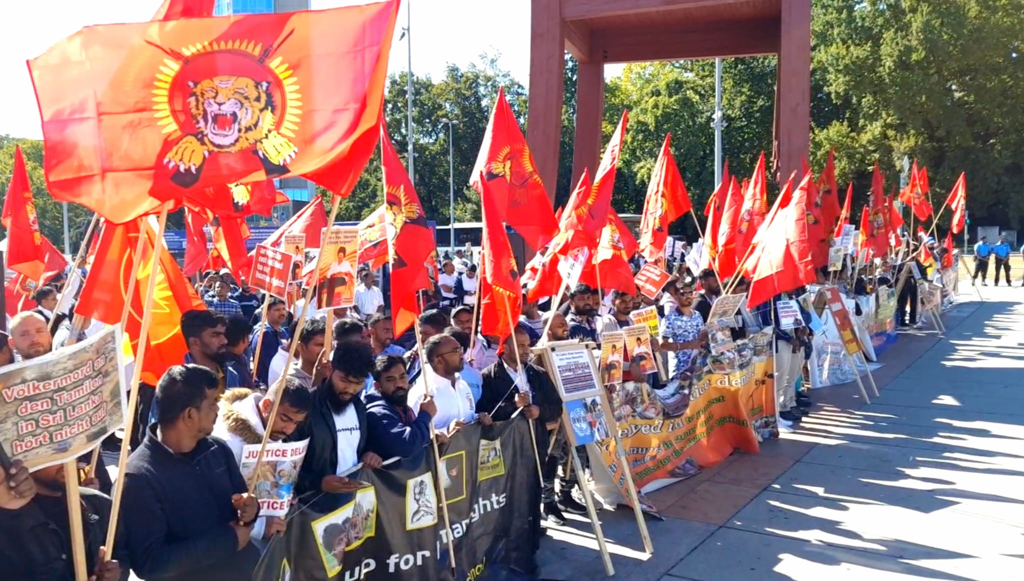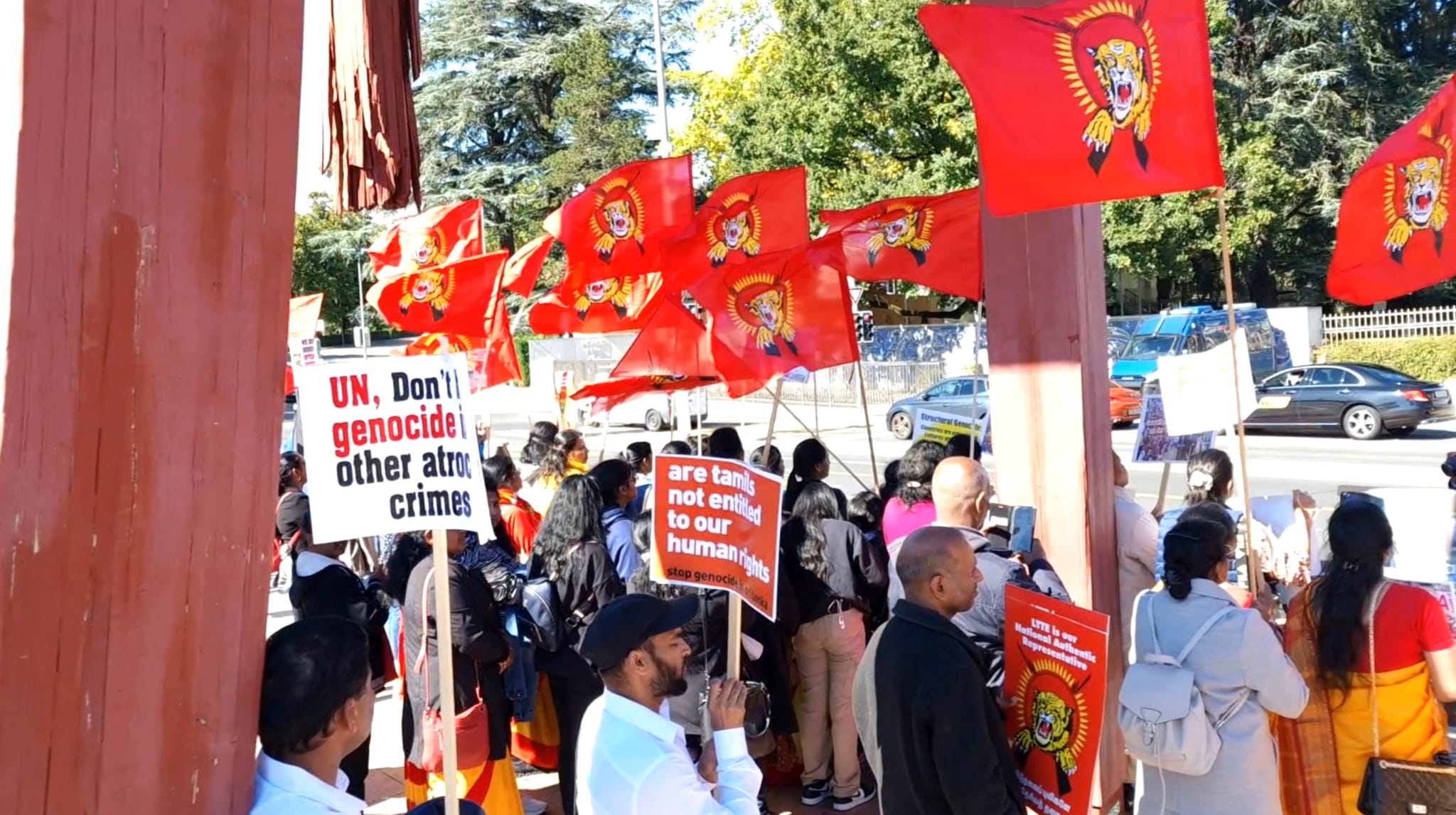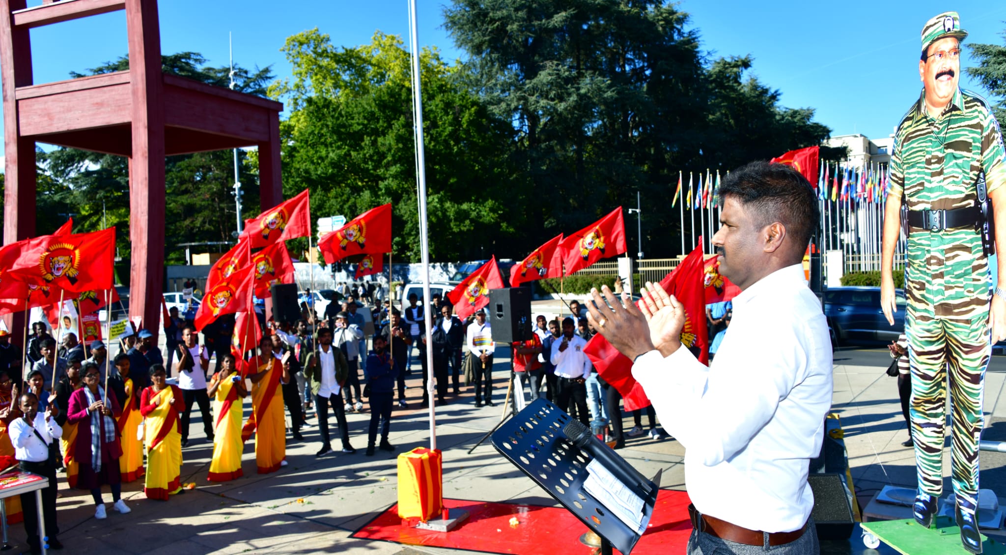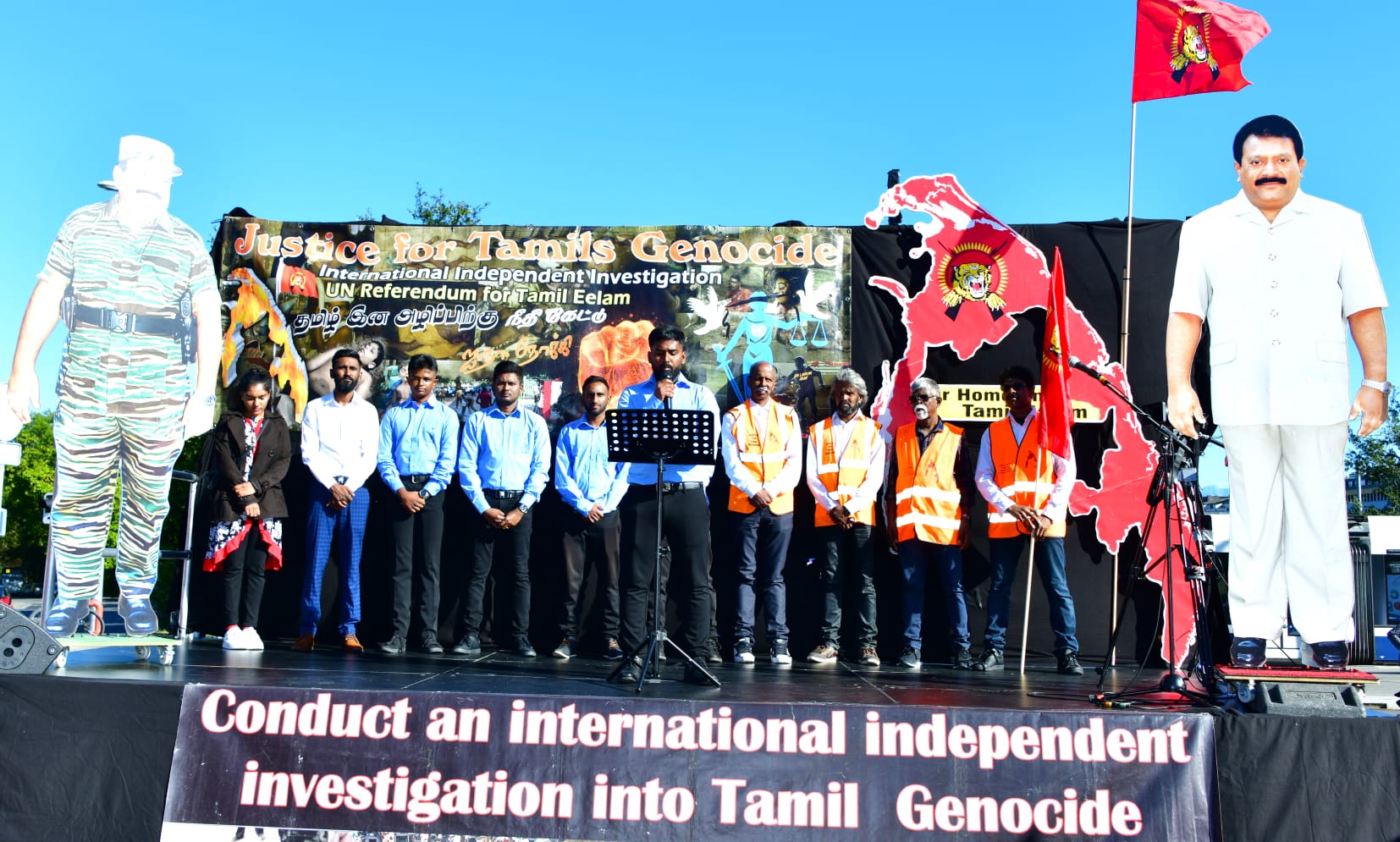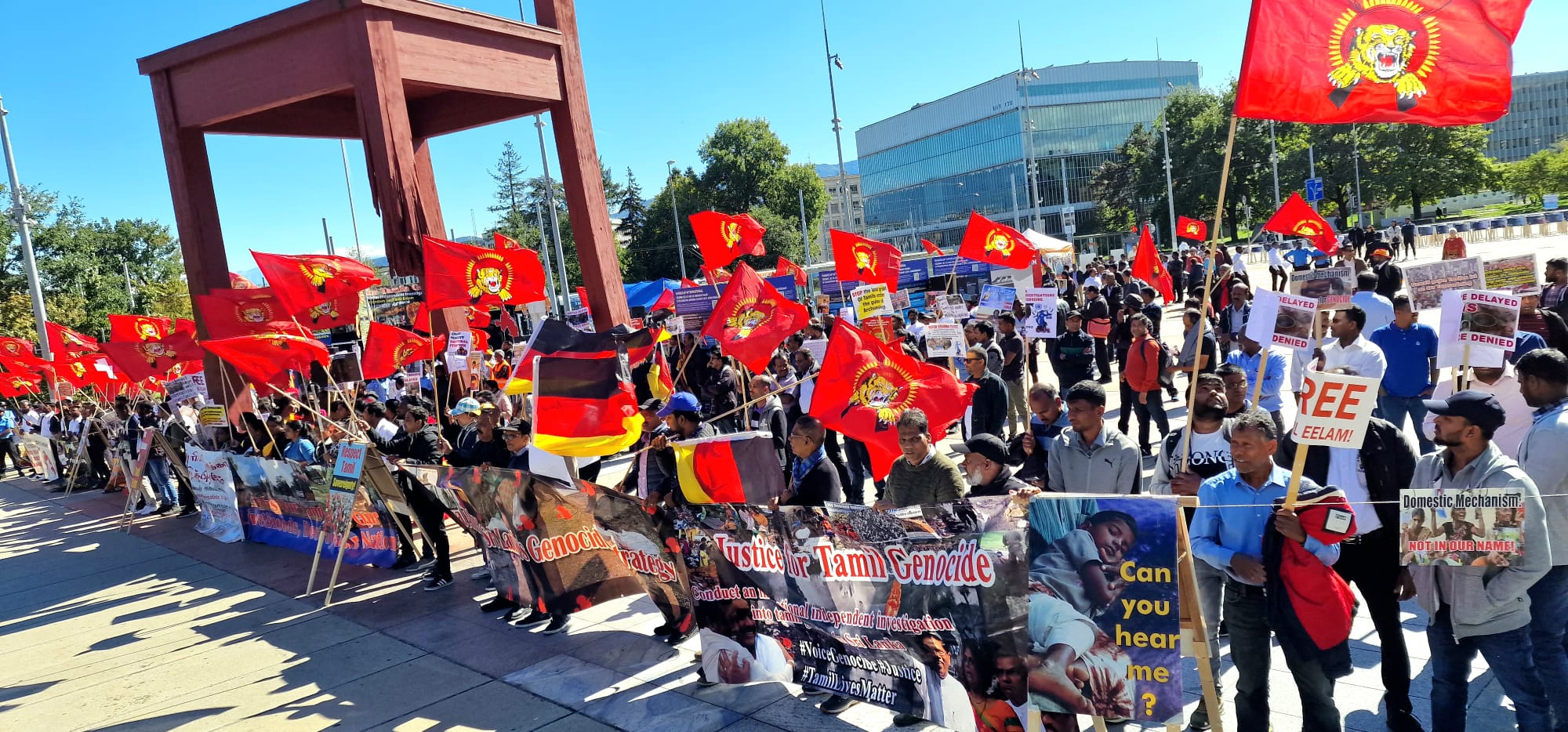 எங்களுக்கான நீதியை எங்களுக்குத் தாருங்கள் என்ற உரிமை முழக்கத்தோடு, சிறிலங்காப் பேரினவாத அரசினால் தொடர்ச்சியாக தமிழ்மக்கள் மீது மேற்கொள்ளப்பட்டுவரும் இன அழிப்பிற்கு நீதிகேட்டு ஐ.நா முன்றல் ஈகைப்பேரொளி முருகதாசன் திடலில் முன்னெடுக்கப்பட்ட கவனயீர்ப்புப் போராட்டத்தில் நூற்றுக்கணக்கான தமிழ்மக்கள்; கலந்துகொண்டிருந்தனர்.